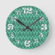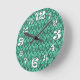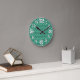 This wall clock has a mid-century modern design of a small oval inside a bigger oval on a field of mint green.