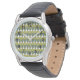 This men's watch has a mid-century modern design of repeating olive green ovals with grey ovals inside.