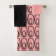 This towel set has a salmon washcloth, a black hand towel, and a bath towel with a mid-century modern design of a small oval inside a bigger oval on a field of salmon.