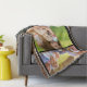 A quality printed throw has its advantages. This is a much finer weave throw than its loopier cousins, and though lighter, it is worth the investment for custom room accessorizing. The back is much prettier than the typical brown, and the fringe on the long sides very vivid, the selvage nicely done. Before photographing, I washed the throw in cold water, delicate, with a thicker woven throw the same size. On tumble dry low, this throw was dry in half the time as the other. This is a very practical quality if you use throws for furniture covers or to wrap up in frequently. The sleekness of the fabric makes it a great layer for accenting or protecting without the feeling of sitting on too much stuff. Perfect for napping or when you feel a light chill coming on. The color printing is beautiful and on this fabric, matched the design and color of my Photoshop image. This is an advantage for blending room fabrics and colors. The fringe on the short sides prints the colors from the design image and therefore varies from the side fringe. I streaked a white fractal line through the plaid pattern to give the illusion of weaving. This printed as crisp as an illusory thread, and put some white in the short side fringe, showing another advantage of print vs loomed- for artistic purposes, line lines, detail, and color integrity can be planned and preserved. My loomed throws have color limitations and more of a needlepoint texture. Print throws reproduce an exact image. The throw felt a little stiff straight out of the package, but this went away in the first delicate wash. Of course I searched the wash water for ink or bleeding and there was none.