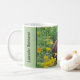 This mug features a close-up photograph of a chocolate Labrador Retriever lying in lush green grass and California poppies as a placeholder photo. Keep this photo or replace it with one of your favourite horizontal photo. Personalise or keep the the text on both sides of the handle.
