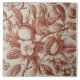 A detailed burgundy and rose overall pattern of pomegranates and blossoms with leaves and branches. Very realistic botanical drawing art that looks like a fine etching. The original tile this is copied from is top quality and, although it is not marked, we think it may be Minton.