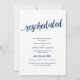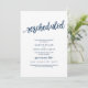 This is a Postponed Wedding Announcement card, with card title, Rescheduled, in Navy blue script font, modern rustic design themed.