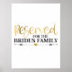 You will love this white and gold calligraphy writing saying, Reserved for the brides family with a golden heart and black laurel wreath.