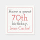 This clean and respectable birthday-themed paper napkin design features a message like "Have a great 70th birthday, Jean-Carlos!", where the name and birthday number can be customised. Customised paper napkins like these could be used at birthday party.