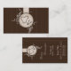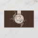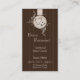 Dark chocolate brown and vintage beige chef and restaurant business card. This restaurant business card is suited for cafes, bistros, chefs, cooks, diners, and the food and drink industry. It features a circle frame with a chef's hat and a fork and knife within the frame. The frame hangs from a ribbon and is adorned by leafy foliage. The background has light transparent stripes. Customise this business card design for your restaurant.