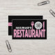 Restaurant text cutlery plate eye-catching business cards. A cool business card template, featuring the word RESTAURANT, the owner’s name, a plate, a fork and knife in pink and white on black background. You can upload your logo on the plate, add your monogram or delete it.