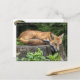 A red fox uses an old tree stump as a place to rest at the forest edge.