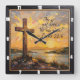 A serene wall clock featuring a rustic wooden cross standing on rocky ground overlooking a peaceful body of water and rolling hills, all bathed in the soft glow of morning light. The central truth, "He is not here, He has risen! - Luke 24:6," is clearly visible. This beautifully painted timepiece evokes the quiet power and profound significance of Easter morning, offering a daily reminder of faith's victory.