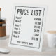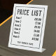 Free-standing price-list for a shop or retail sales outlet. Alter prices as you wish. Displays up to 6 items and prices. Black and white.