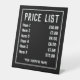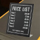 Free-standing price-list for a shop or retail sales outlet. Alter prices as you wish. Displays up to 6 items and prices. Black and white.
