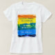 This tee has an artistic, colourful painted background with bands of vivid colours: orange, yellow, green, sky blue, and ocean blue.