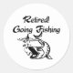 Retired! Going Fishing. Black text with a black and white fish about to bite the bait on a hook.