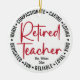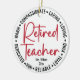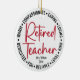 Retired teacher Christmas ornament with teaching qualities: warm, compassionate, caring, loving, kind, loyal, reliable, fun, dedicated. Handwriting script text based design in black and red. Add your teacher's name and retirement year. Makes the perfect retirement gift for your favourite teacher to celebrate their first Christmas as a retired teacher.
