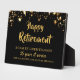 Create a personalized retirement commemorative keepsake award plaque to recognize a retiree. The black and gold stars design with HAPPY RETIREMENT in modern hand lettered brush script typography and personalized with the retiree's name, years of service and organization name or other custom text. Contact the designer via Zazzle Chat or makeitaboutyoustore@gmail.com if you'd like this design modified, on another product or would like coordinating items.