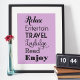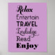 Retirement gift wall art poster print design features words that spell RETIRE in stylish black type: "Relax, Entertain, Travel, Indulge, Read, Enjoy" with "Wishing you a very happy retirement" text. Use the "customize it" feature to change the light purple / violet background color.