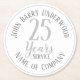 Paper coasters to celebrate a retirement or long service award party. Retirement coasters. Employee or staff member retiring from work. Design includes the name of the person as well as company or business. Also the number of years.