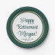 Add an elegant touch to retirement party decorations with custom green and gold round paper plates. All wording is simple to personalise for any occasion. Customise with years of service, company name, funny quote or message of your choice. The design features a faux foil border, modern script calligraphy, and stylish vintage typography. Please note that gold is printed colour, not metallic foil. The minimal classic design has a professional look suitable for him or for her, a retiring coworker, employee, friend or family member. Congratulations and Happy Retirement!
