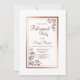 An elegant rose gold/copper bordered floral retirement party invitation featuring warm gold floral foliage embellishments in the diagonal corners.