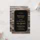 A rustic gold bordered wood retirement dinner party invitation with gold text on a black background.