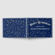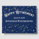 Retirement party sign in guest book with the lucky retiree's name, date of retirement and Happy Retirement text. The background design is golden stars on a dark blue background.