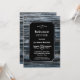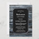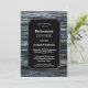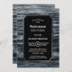 A rustic silver-bordered blue and grey barn wood retirement party invitation with the white text highlighted on a black background.