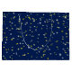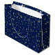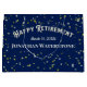 Retirement gift bag with the lucky retiree's name, date of retirement and Happy Retirement text. The background design is golden stars on a dark blue background.