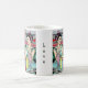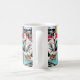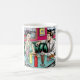 Retro pop art comic book style coffee mug. Cute 1950's era couple sitting in a diner with milkshakes, fries and cheeseburgers on a date. Colours used are teal, pink, red, black and yellow. Old-fashioned nostalgia. This picture is hand drawn by myself.