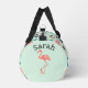 Mid century style with flamingos, random rectangles and atoms in a period appropriate palette of pink, turquoise and brown. Background is mint green. Your name on the ends above a single flamingo.