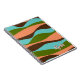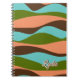 This notebook features a 1970s style design which boasts a stunning colour palette. The dominant colours featured are peach, olive green, teal, and dark brown. The design showcases abstract wavy stripes that add a touch movement to the overall aesthetic. These stripes are a nod to the artistic trends of the 1970s. To make this notebook truly unique, there is also the option to include custom text for your name.