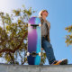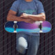 Retro 1980 synthwave glowing neon lights landscape skateboard