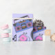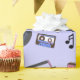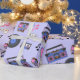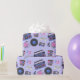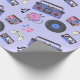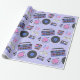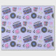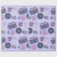 Retro blue and pink Vinyl Records, boomboxes, video gaming and cassette tapes birthday gift wrap.