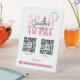 Trendy and chic business Scan to Pay sign with space for 2 QR codes and your business name and contact details. This payment sign for business features retro fonts in pink and trendy script for your business name, or you can even add your logo. This two QR code table top sign will make it easier than ever for your customers to make a payment directly from their phone or tablet, perfect to use at your till, craft markets or to display in your store.
