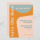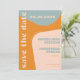 Abstract shapes retro vintage 70s style unique wedding save the date with bold typography in a trendy modern boho dusty blue, orange, and light pink pastel chic color palette. +++++++ Please note that all the colors are changeable. ++++++++++++ The card is suitable for casual stylish contemporary weddings.