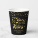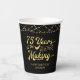 Retro 75th birthday party personalised paper cups featuring the title 75 YEARS IN THE MAKING in a calligraphy script typography which incorporates his or her birth year within the design and your custom text below (the sample shows HAPPY BIRTHDAY NAME) in gold accented with string lights and your choice of background colour (shown in black). ASSISTANCE: For help with design modification or personalisation, transferring the design to another product or if you would like coordinating items, contact the designer BEFORE ORDERING via the Zazzle Chat MESSAGE tab below or email makeitaboutyoustore@gmail.com.