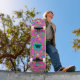Customisable monogram scateboard in retro 1980s and 1990s theme, with bright and colourful vintage items such as cassette player, Rubik's cube, sweets, scrunchies, etc. in hot pink, turquoise, and yellow colours.
