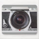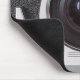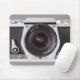 This mousepad design features the image of a retro black and chrome single lens reflex (SLR) camera dating from the 70s or 80s. The black and chrome camera has a filigree scroll effect etched on the surrounding chrome body.