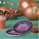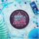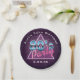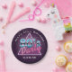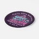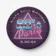 80's Party paper plate featuring a retro style typography of '80's Party''. Designs include elements of dark purple, blues, and pinks, sci-fi futuristic elements from the 80s, triangle and grid. Customise with event and date.