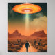 AI generated art made to look like a vintage art of a man walking alone in the desert about ready to be abducted by aliens