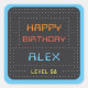 These awesome gamer theme birthday favour stickers with a vintage arcade game vibe feature retro lettering on a dark grey and white dot matrix grid. "Happy Birthday [Name]" appears in retro digital lettering, with "Level [age]" beneath.