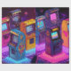 A group of vintage arcade machines stands illuminated by vibrant neon lights. The scene is set against a backdrop of a starry galaxy, creating a nostalgic yet futuristic atmosphere.