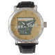 Stylish wristwatch features retro style Arkansas state silhouette and lettering.
