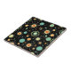 Step back into the groovy era with this vibrant retro atomic starburst pattern on a sleek black background. Bold circles, spiky bursts, and abstract orbits in creamy yellow, teal, coral orange, and mint green evoke the optimistic spirit of midcentury modern design.