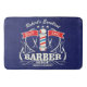 Barbers and stylists will appreciate this old fashioned and retro style Barbershop work floor mat. Place at your work station and show off your style. Features an old fashioned stripe barber pole, scissors, razors. Have fun creating a monogram gift for your favorite barber. Blue background has stripped stipple look.