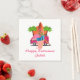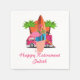 Retro Beach Surf Theme Retirement Party napkins with pink flamingo holding a retro surfboard in front of a 70s style minivan under two tropical palm trees on the beach. Perfect disposable paper retirement party napkins for anyone who loves the beach, surfing, the 70s, or flamingos. Great for Florida retirements, a luau dinner or a pool party.