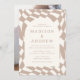 Invite guests to celebrate your special day with stylish Retro Beige Chequerboard photo wedding invitations! The invite displays your names and wedding details in desert sand-coloured lettering surrounded by a light cream arch frame. The background features an abstract chequerboard pattern with a desert sand and cream colour scheme. The invite reverses to display your full-bleed vertical engagement photo.