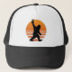 Very cool bigfoot sasquatch yeti cartoon walking and holding up a peace sign, with a retro sunset, aged grungy style design.