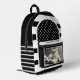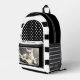 Black and white backpack featuring a retro striped design with polka dots and your custom photo (optional; you can also leave the funny cat reading a book, if you like). Beautiful for school or a book reading club.