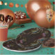 Atomic swirl, 50s space age, mid century modern retro pattern. Black with purple, blue, yellow colour swirls.
