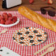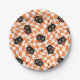 This vintage-inspired pattern features charming black cat faces with large, wide eyes and open mouths, giving them an expression of surprise or excitement. The cats are set against a vibrant, retro orange and cream chequered background with a wavy, distorted effect, evoking a sense of playful movement. Small black stars are scattered throughout the design, adding an extra element of whimsy and nostalgia. The combination of the classic Halloween colours and the bold, stylised cat faces creates a fun, slightly spooky aesthetic that harkens back to mid-century vintage design.